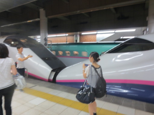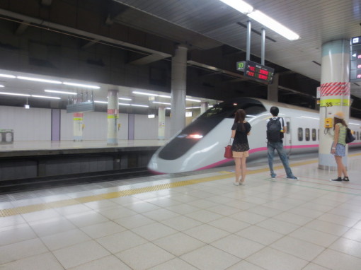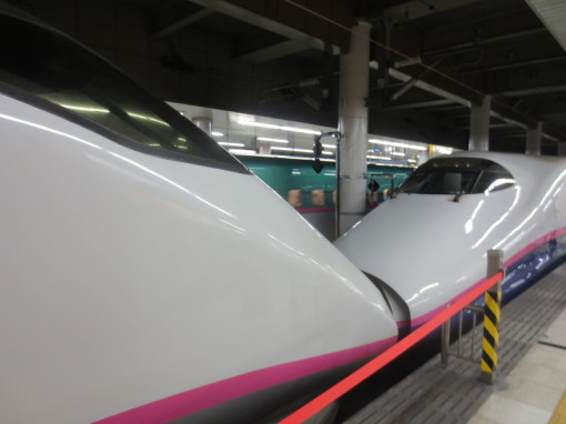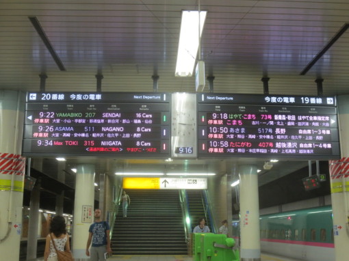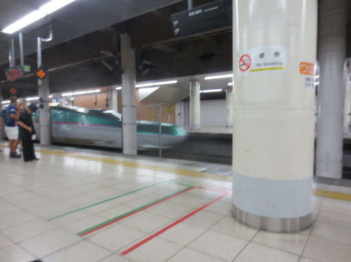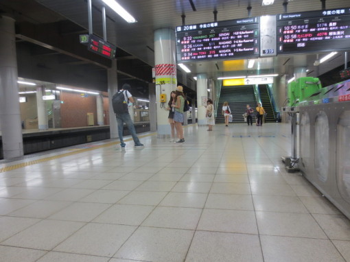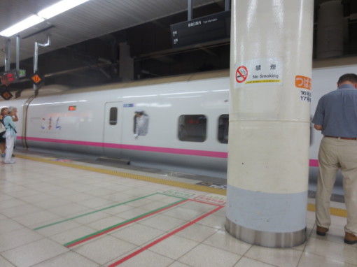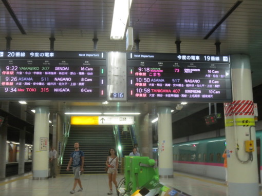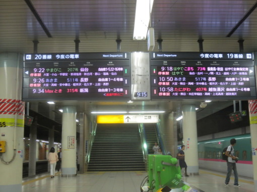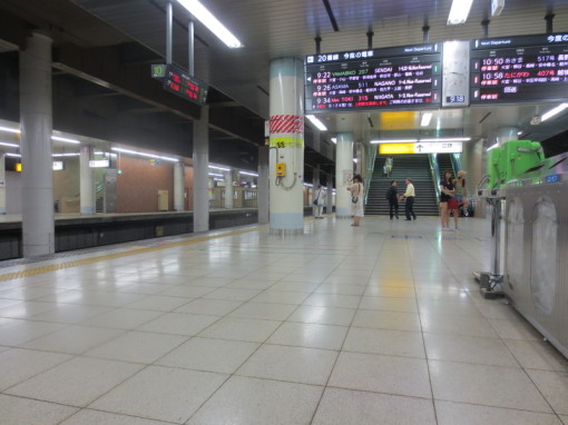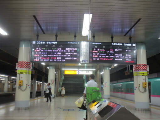 Bullet train platform in the basement of Tokyo train station. Information boards alternate between Japanese and English. No trash cans; just the recycling bins in the foreground.